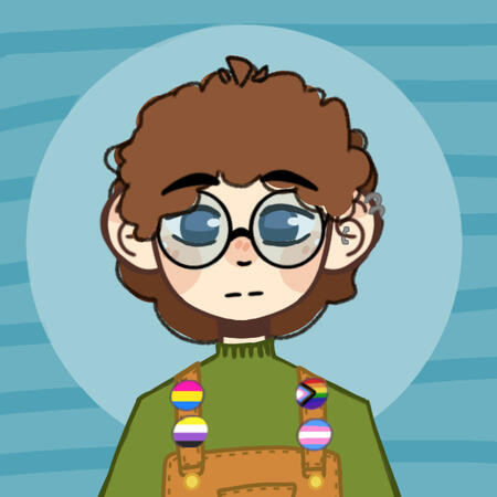 ID: a picrew of a white person with short curly brown hair. They have blue eyes, black glasses, and a neutral expression. They have three piercings in their right ear. They are wearing a green sweater and brown overalls. Pinned on the overalls are four pins: the pan, nonbinary, progress, and trans pride flags. The pan flag has three stripes that are, from top to bottom, pink, yellow, blue. The nonbinary flag has four stripes that are, from top to bottom, yellow, white, purple, black. The progress flag has 6 stripes that are, from top to bottom, red, orange, yellow, green, blue, purple. It also has a triangle on the side. From the inside to the outside of the triangle, the stripes are white, pink, blue, brown, black. The trans flag has 5 stripes that are, from top to bottom, blue, pink, white, pink, blue. The background is blue and striped. End ID