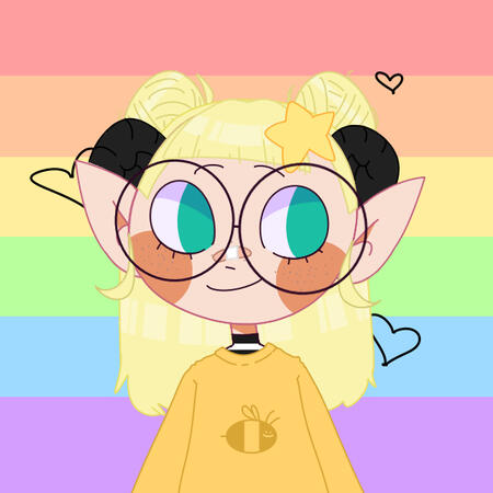 ID: a picrew of a white person with long blond hair and green eyes. Their hair is mostly down, except for two buns on either side of their head. They have pointy elf ears and black ram horns. They are weaing black glasses, a bandaid on their nose, a star in their hair, a black and white striped shirt, and a yellow jumper with a bee on it. The background is a pastel rainbow flag, and has black hearts on it. They are smiling and looking to the right. End ID