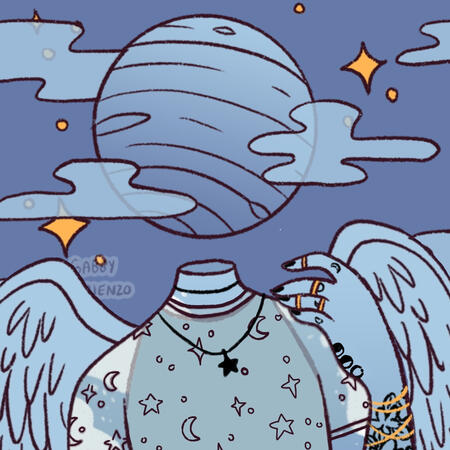 ID: a picrew of a person with blue skin and a blue planet for a head, which is detached from their neck. They have white vitiligo and are weaing a blue singlet and a translucent blue shirt with stars and moons on it. Their right hand is nearly touching where their face would be if they had one. They have on a black star necklace, four gold rings, and a gold bracelet that is wrapped four times around their arm. They have two rings on their ring finger, one on their middle, and one on their pointer. On each of their knuckles is a tattoo of a different phase of the moon. On the side of their hand is a tatto with three different phases of the moon. On their arm is a flower tattoo. Their nails are painted black. They have blue feathered wings, similar to an angel. Around their head are blue clouds and yellow sparkles and stars. The background is blue. End ID